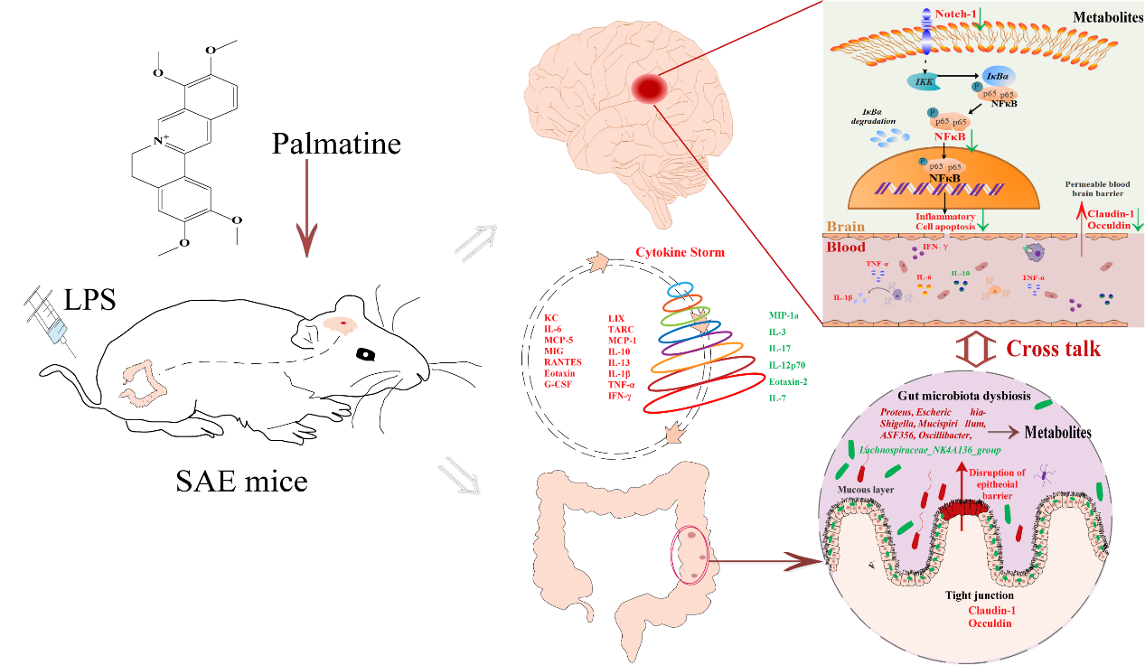 脓毒症相关性脑病(SAE)是脓毒症常见的神经系统并发症,在重症监护室的患者中广泛存在,与较高的发病率和死亡率相关,从而对人类健康构成重大威胁。由于SAE发病机制的复杂性,迄今为止仍然缺乏有效的治疗方案,包括药剂和治疗方式。巴马汀在调节炎症、改善脓毒症方面表现出独特的功效。然而,巴马汀治疗SAE的确切功能及其潜在机制尚未阐明。本研究首先通过行为实验、存活率分析、组织学分析、免疫荧光染色、ELISA分析来评估巴马汀对SAE小鼠的功效,接着采用定量玻璃小鼠炎症芯片观察巴马汀对SAE小鼠炎症风暴的影响,进一步采用实时定量和蛋白质印迹分析来检查Notch1/核因子-κB通路中相关靶标的表达。最后,基于脑组织代谢组学的分析,以检测差异表达的代谢物和代谢途径,同时对粪便样本进行微生物16S rRNA分析和非靶向代谢组学分析,以鉴定与SAE相关的特定菌群和代谢物,进一步研究巴马汀对SAE小鼠的作用机制。结果表明,巴马汀显著改善LPS诱导的SAE小鼠的神经功能,减少脑组织细胞凋亡,并降低炎症细胞因子水平。同时,研究结果还证明了巴马汀在调节Notch1/NF-κB通路的关键成分、可以增强紧密连接蛋白的表达、改善肠道通透性、促进有益菌(如毛螺旋菌属NK4A136)的生长、抑制有害菌(如埃希杆菌-志贺菌属)的增殖以及缓解代谢紊乱等方面的潜力。本研究结果证实了巴马汀治疗SAE的疗效,为进一步探索SAE治疗以及巴马汀的进展和研究奠定了坚实的基础。